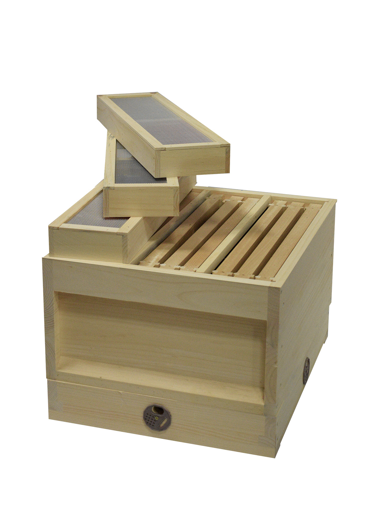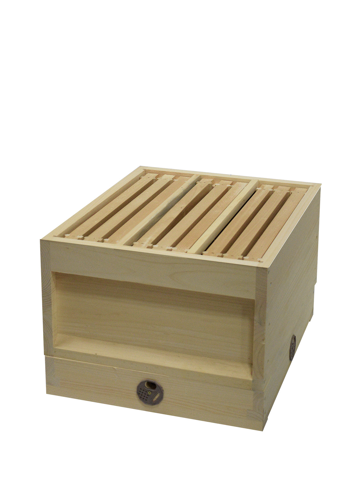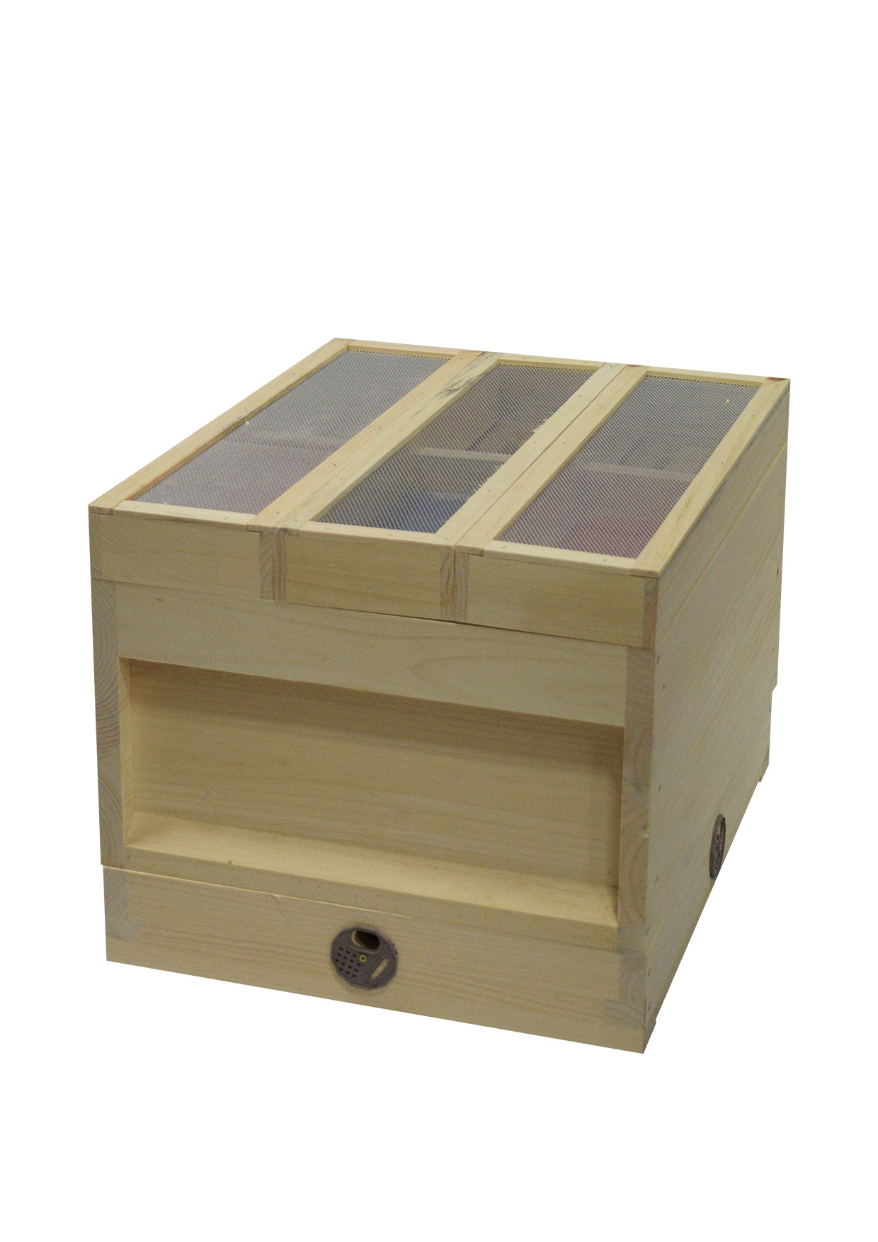 - Enthält einen Metalldeckel, einen Innendeckel, 3 Fütterer, Antivarroa-Gitterboden und Kunststoff-Trennwände