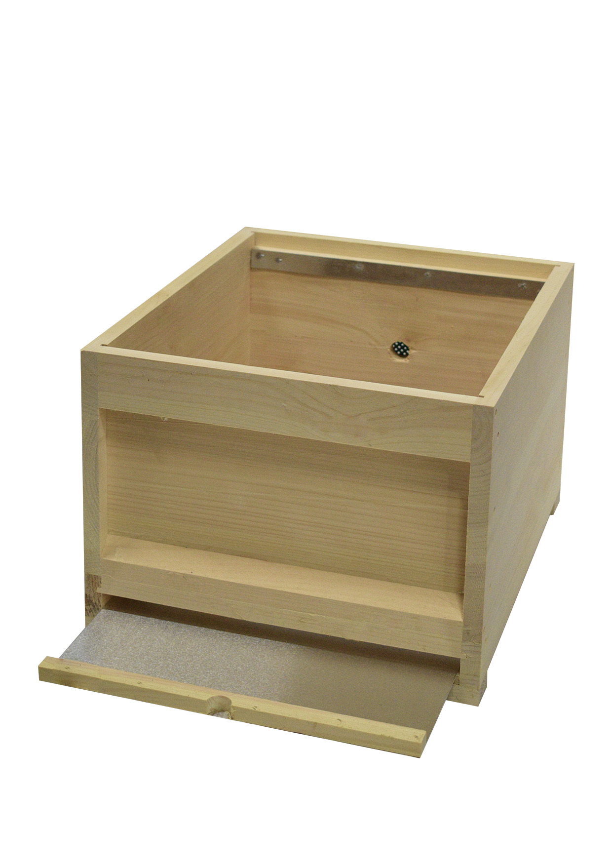 - Beute/Kasten: Gefertigt aus Weymouthskiefer mit festem Gitterboden aus Edelstahl. Maße: 520 mm x 420 mm x 300 mm, Wandstärke: 20 mm.